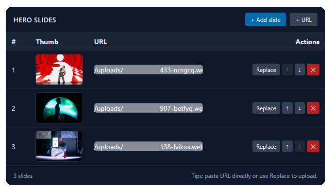 Each page is built from independent blocks: hero, highlights, gallery, testimonials, contact, etc. This keeps your content structured and easy to read, instead of being trapped in one big, rigid page template.